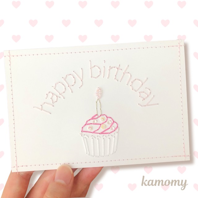 happy birthdayの文字と カップケーキを手刺繍したポストカード♡ ろうそくの火にはつぶつぶビーズを、 ケーキにはキラッと輝くスパンコールをトッピングしました⋆⸜♡⸝⋆ 大切な人に温もりのあるメッセージカードを プレゼントしませんか?( ˶ˆ꒳ˆ˵ ) お部屋のお気に入りスペースに飾って 見るたびに心がふわっと癒されますように(っ◜ω◝ c)♡ ビーズやスパンコールなど全て ひとつひとつ手縫いしております。 繊細な作品なので、丁寧なお取り扱いをお願い致します。 裏面は糸が見えないよう、 同じサイズのポストカードを貼り合わせ 周りにミシンでステッチをかけております。 発送までに約1週間〜2週間ほど お時間をいただきます。 ご理解いただいた上でご購入をお願い致します。