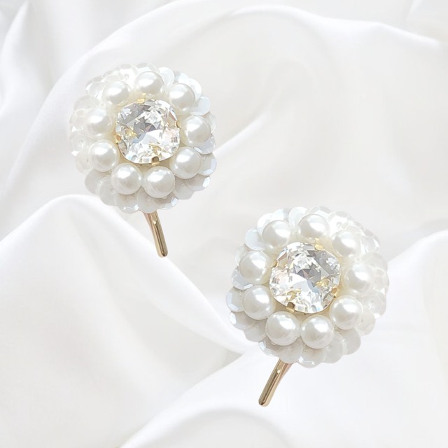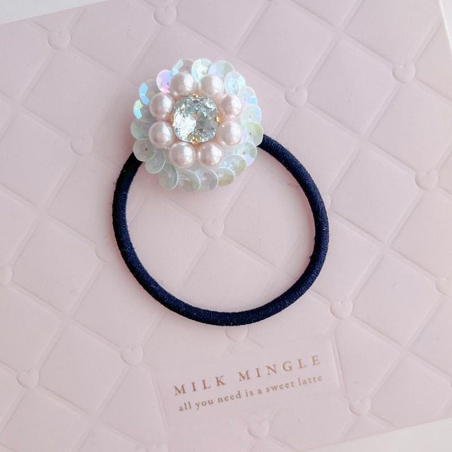 ビジュー×パール×スパンコールが キラキラと輝くポニーフックです。 どんなファッションにも合わせやすい!色々なファッションを楽しみたい方におすすめ。 結んだところにさっと差し込むだけで 簡単に可愛いヘアスタイルに♡ ビジューは安価なガラスビジューではなく 輝きの美しい高品質なビジューを使用しています。 ビジューやパールは全て ひとつひとつ手で縫い付けております。 サイズ:約3cm