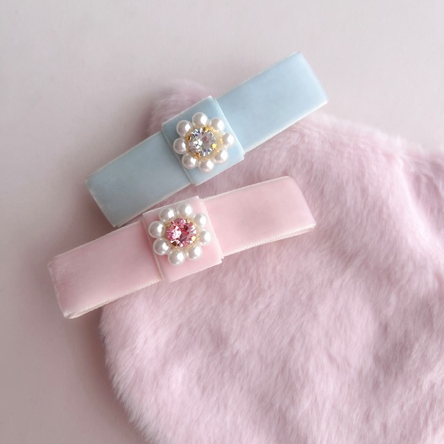ベルベットリボンのバレッタ♡ ✔️長さ約8cm ✔️ピンクとブルーの2カラー ✔️左右とも使用可能◎ パステルカラーの色味が可愛い ベルベット素材のリボン♡ ビジューとパールを手縫いした お花のようなモチーフがついた ガーリーなリボンバレッタ♡ ハーフアップの結び目やサイドに留めたりして 簡単に可愛いヘアアレンジが出来ちゃいます◎ ビジューは安価なガラスビジューではなく 輝きの美しい高品質なビジューを使用しています。 ビジューやパールは ひとつひとつ手で縫い付けております。 発送までに約1週間ほど お時間をいただきます。