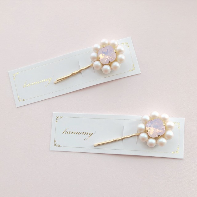 ピンクオパールのビジューと ピンクがかったホワイトパールの組み合わせが 相性バツグンのヘアピンです⋈ お花のようなモチーフで さっと留めるだけで簡単なヘアアレンジに。 ゴールド×ピンクが上品ガーリー♡ ビジューやパールは全て ひとつひとつ手で縫い付け、 裏面は合皮と合わせて縁取りをしています。 サイズ: ビジュー部分 約2.5cm 全長 約5.5cm