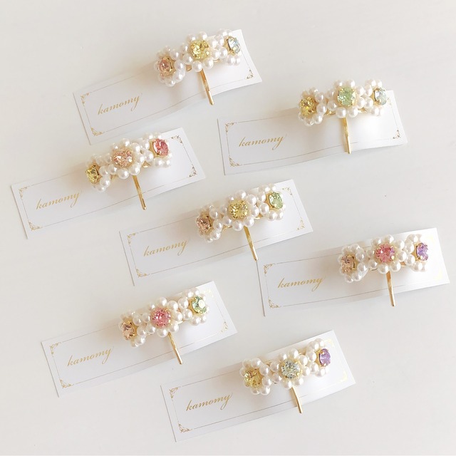 ビジューとパールを手縫いした お花のようなモチーフが並んだキラキラなバレッタ✧ ✔️長さ約7cm ✔️左右とも使用可能◎ ✔️パール泊のボックス入り カラーは4種類♡ ・ピンク&オレンジ ・ミルキーピンク ・ライトブルー ・グリーン&イエロー ビジューは安価なガラスビジューではなく 輝きの美しい高品質なビジューを使用しています。 ビジューやパールは全て ひとつひとつ手縫いしています。