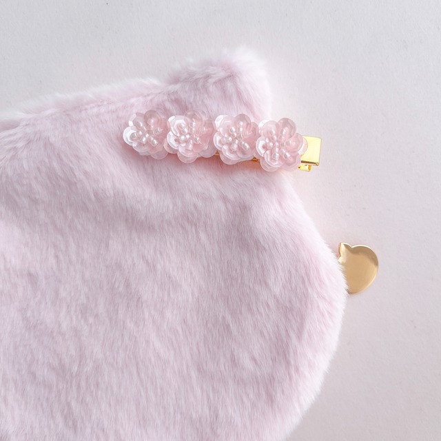 小さなお花に、とびきりの”ときめき”を添えて。 丁寧にひとつひとつ縫い合わせた、お花を並べたヘアピンです。 淡いピンクのお花が、髪にそっと華やぎをプラスしてくれます。 シンプルなまとめ髪に差すだけで、ふんわり上品に。 デイリーにはもちろん、特別なお出かけにもぴったりのアイテムです。 ⸻ おすすめのシーン ・アフタヌーンティーやカフェでの女子会 ・デートやお呼ばれなど特別な日 ・ワンピースやガーリースタイルに合わせて ⸻ 仕様 ・サイズ:約cm ・カラー:淡いピンク × ゴールドピン ・重さ:約g ⸻ 発送まで1週間ほどお時間をいただきます。