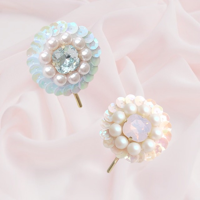ビジュー×パール×スパンコールが キラキラと輝くポニーフックです。 ブルー✧ピンクパールとの組み合わせが甘くてファンシー!パステルカラーが好きな方におすすめ。 ピンク✧ピンクオパールのビジューと、ピンクがかったホワイトパールとの相性がバツグン!ガーリーファッションが好きな方におすすめ。 結んだところにさっと差し込むだけで 簡単に可愛いヘアスタイルに。 ビジューは安価なガラスビジューではなく 輝きの美しい高品質なビジューを使用しています。 ビジューやパールは全て ひとつひとつ手で縫い付けております。 サイズ:約3.5cm