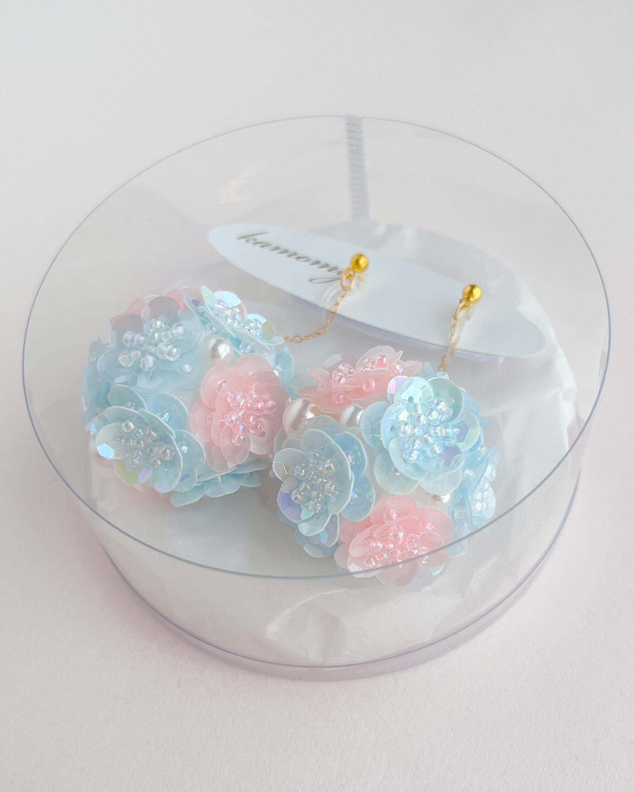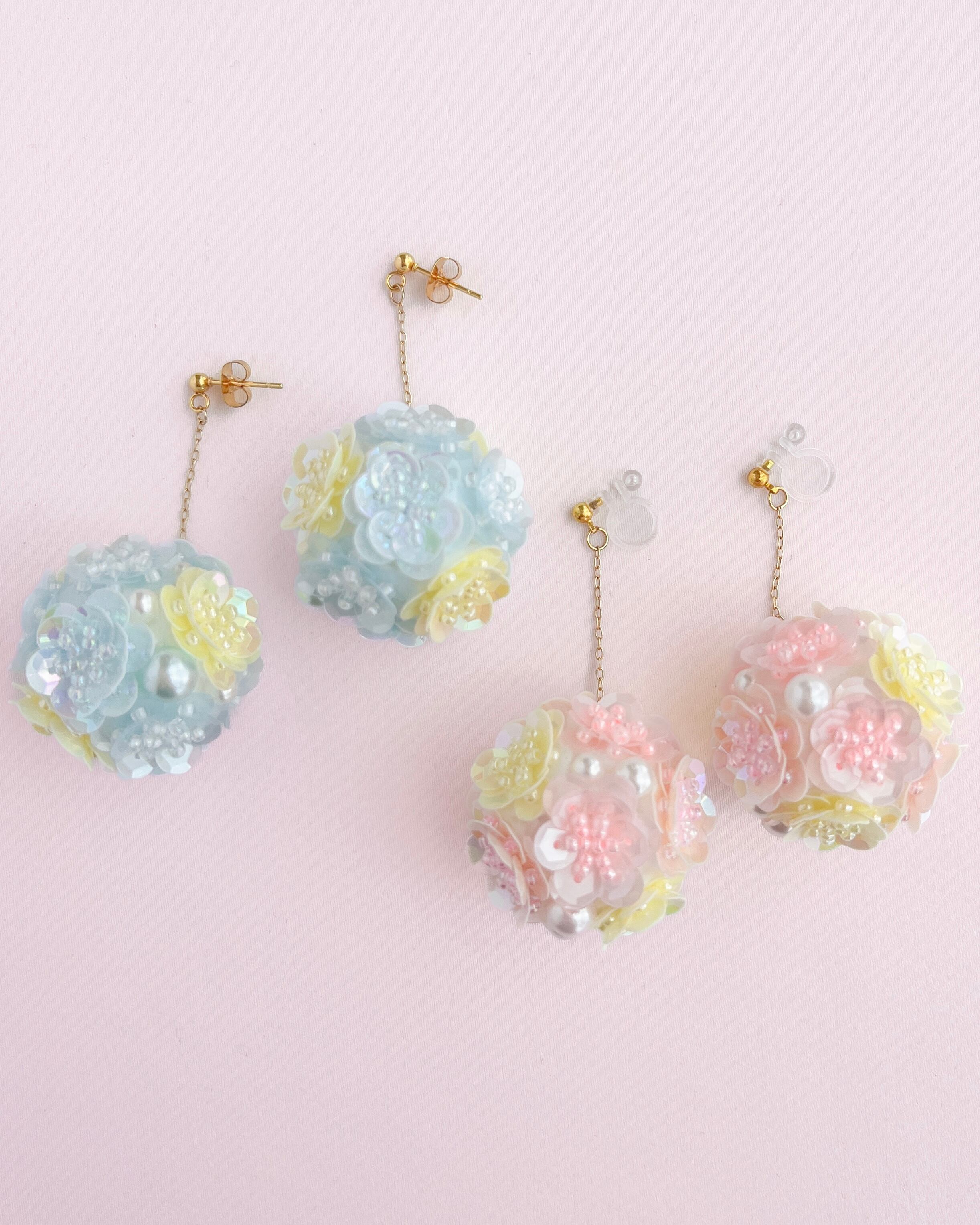 丁寧に手縫いで仕立てた、ころんと可愛いお花のピアス/イヤリングです。