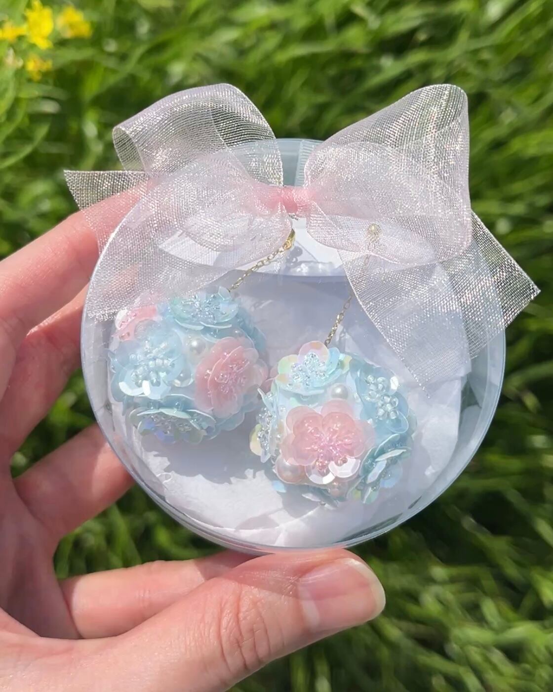ふわっとしたボリュームと、ところどころにきらめくパールが、耳元をふんわり華やかに彩ります。
