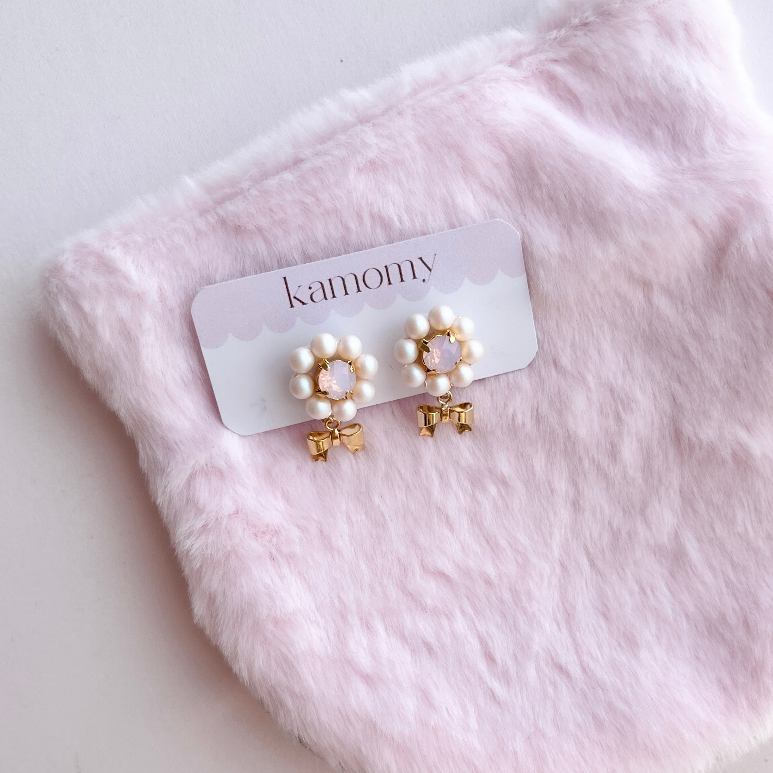 上品で柔らかい雰囲気の、ミルキーピンクの小さめイヤリングです。